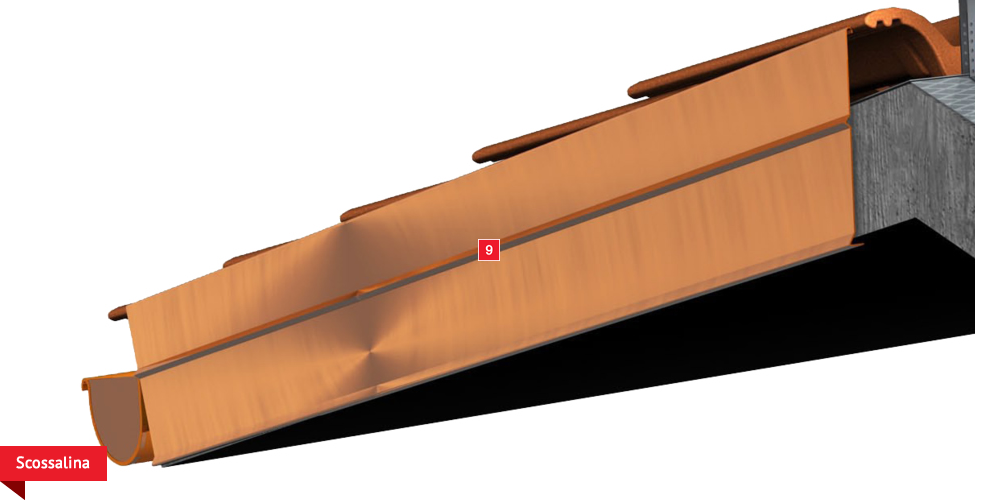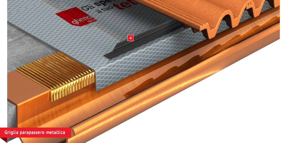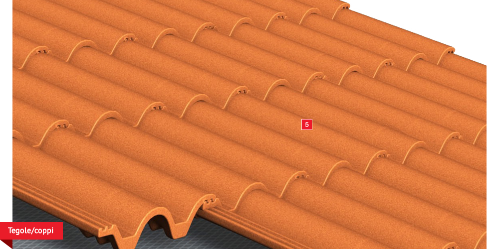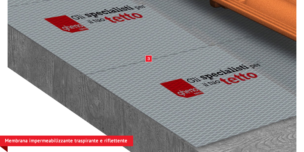 , sviluppata specificatamente per i tetti, dalle notevoli doti di resistenza meccanica, stabilizzata ai raggi UV, antiscivolo ed antiriflesso; la capacità di traspirazione consente al tetto di eliminare eventuali residui di umidità. Lo strato metallizzato riflettente respinge fino al 60% del calore emesso sottoforma di raggi infrarossi dalle tegole o dai dai coppi riscaldati dal sole e riduce del 20% il calore in arrivo dalla copertura ottenendo così un risparmio del 30% dell’energia annuale utilizzata in riscaldamento e/o condizionamento. Manto di copertura formato da tegole o coppi