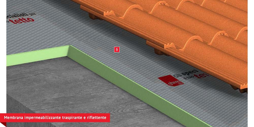, sviluppata specificatamente per i tetti, dalle notevoli doti di resistenza meccanica, stabilizzata ai raggi UV, antiscivolo ed antiriflesso; la capacità di traspirazione consente al tetto di eliminare eventuali residui di umidità. Lo strato metallizzato riflettente respinge fino al 60% del calore emesso sottoforma di raggi infrarossi dalle tegole o dai dai coppi riscaldati dal sole e riduce del 20% il calore in arrivo dalla copertura ottenendo così un risparmio del 30% dell’energia annuale utilizzata in riscaldamento e/o condizionamento. Isolamento termico