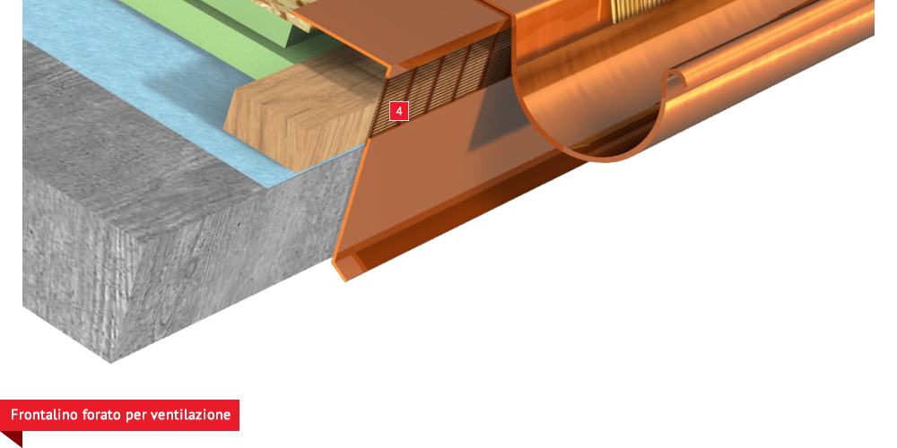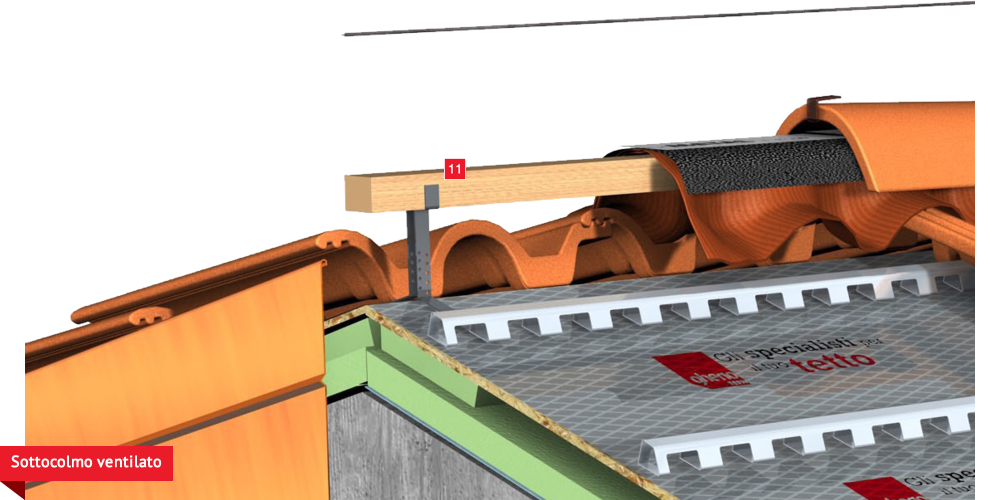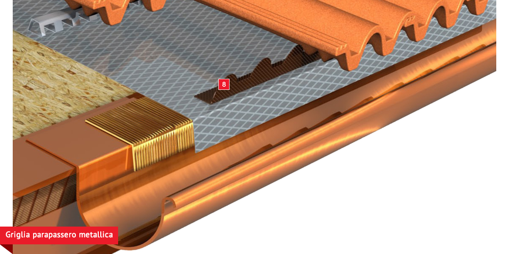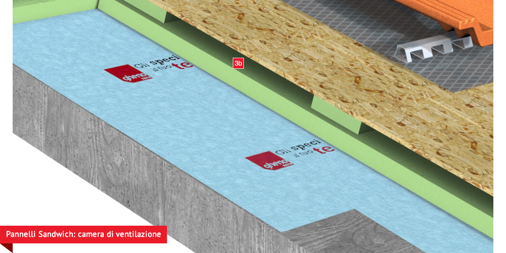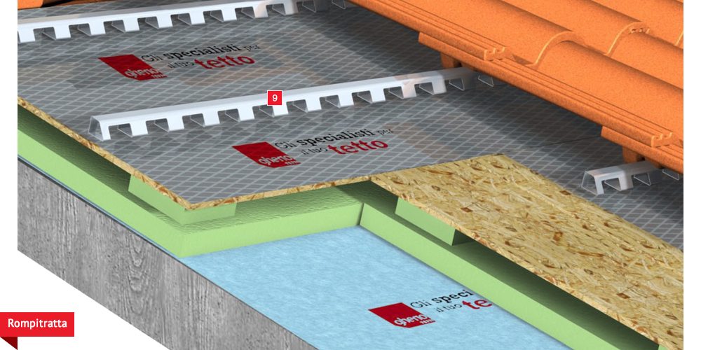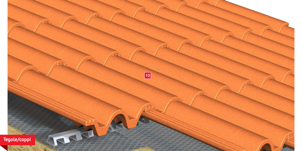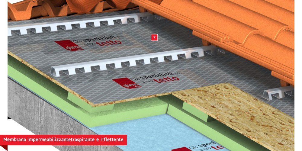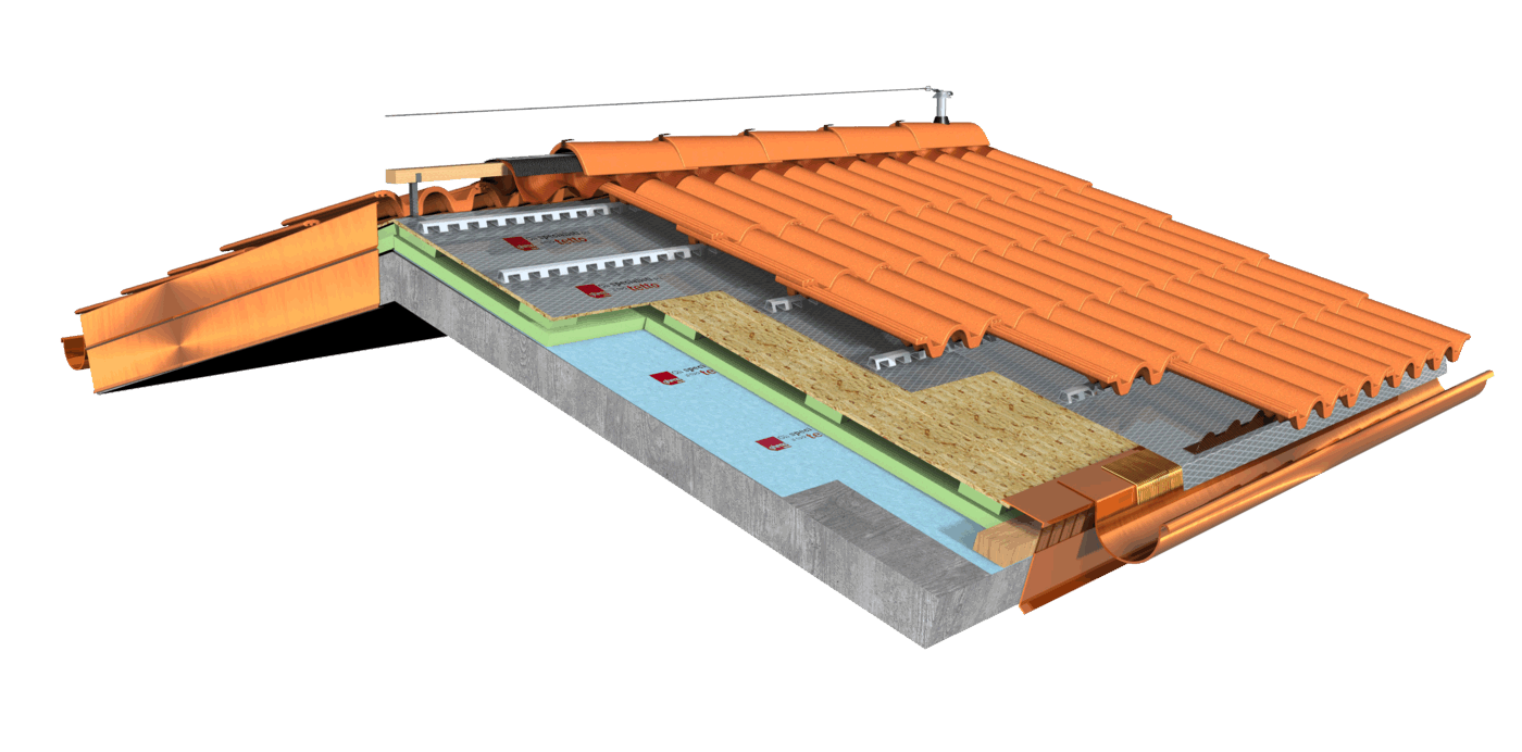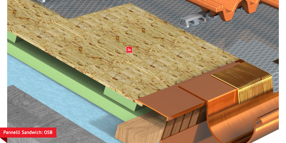 Pacchetto di copertura composto da un freno vapore impermeabilizzante ed altamente traspirante  , con tessuto non tessuto nella parte sottostante per il recupero ed il trasferimento in grondaia di eventuali condense in arrivo dagli ambienti sottostanti. Pannelli Sandwich  formati da un isolante termico ad alta densità e traspirabilità, da una camera d’aria  per la ventilazione che consente lo smaltimento del calore della copertura e da un piano di posa in lastra di legno fenolico OSB  per la posa delle tegole o dei coppi migliorando ulteriormente il confort abitativo sia d’estate che d’inverno; permette agli ambienti sottostanti di abbassare maggiormente la temperatura interna d’estate e di mantenere più a lungo il calore d’inverno. Impermeabilizzazione sottotegola o coppo con una seconda membrana impermeabilizzante altamente traspirante e riflettente  , sviluppata specificatamente per i tetti, dalle notevoli doti di resistenza meccanica, stabilizzata ai raggi UV, antiscivolo ed antiriflesso; la capacità di traspirazione consente al tetto di eliminare eventuali residui di umidità. Lo strato metallizzato riflettente respinge fino al 60% del calore emesso sottoforma di raggi infrarossi dalle tegole o dai dai coppi riscaldati dal sole e riduce del 20% il calore in arrivo dalla copertura ottenendo così un risparmio del 30% dell’energia annuale utilizzata in riscaldamento e/o condizionamento. Frontalino forato  sottogrondaia per il passaggio dell’aria all’interno della camera di ventilazione. Manto di copertura formato da tegole o coppi  , trattenuto da una rompitratta  in profili metallici, specifici per le grandi pendenze, microventilazione tramite griglie parapassero metalliche  sottocolmo ventilato .