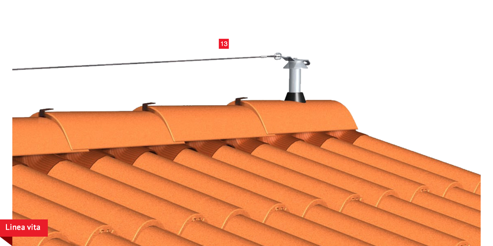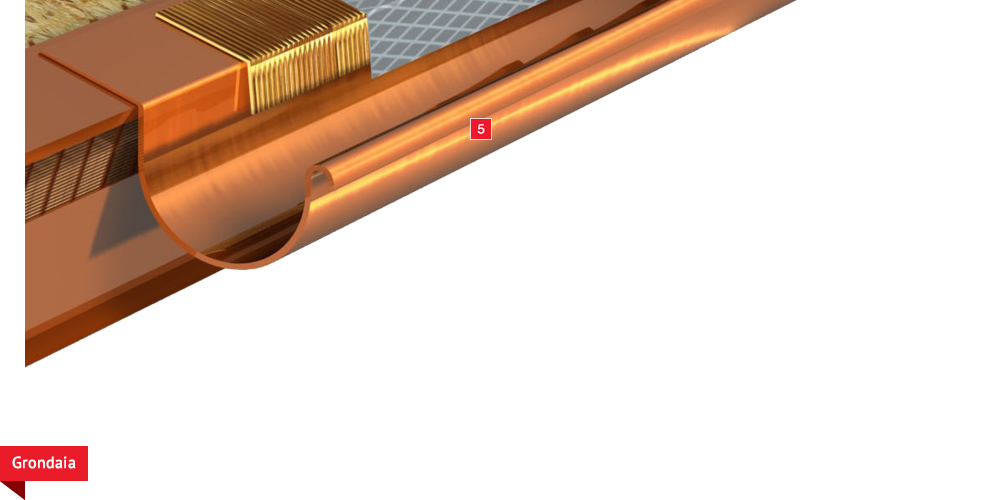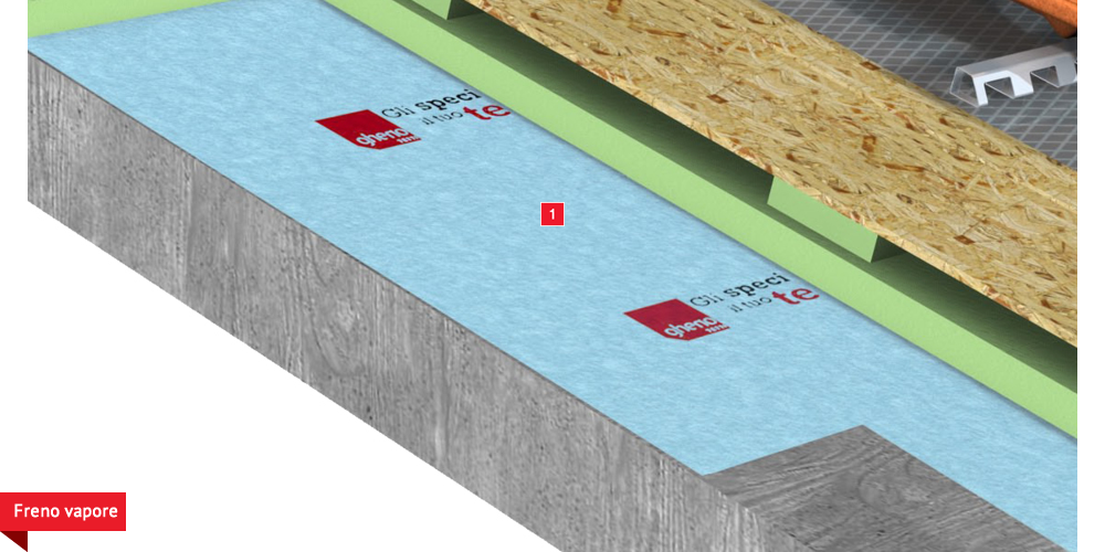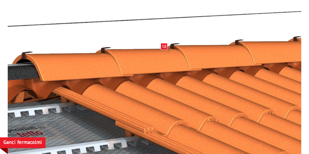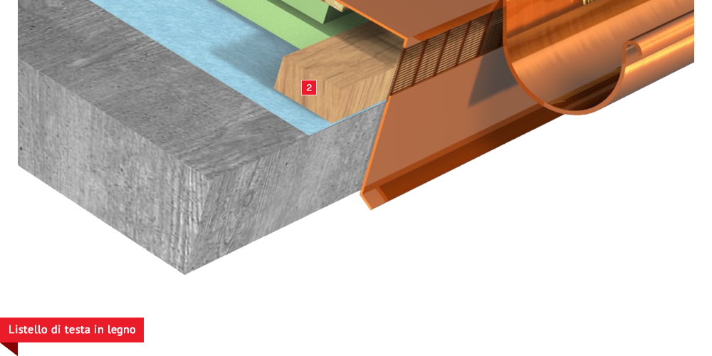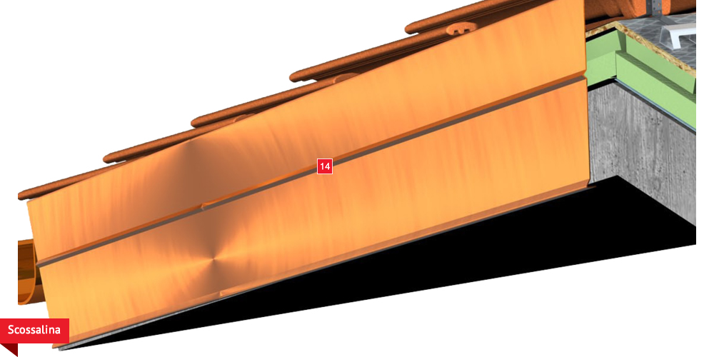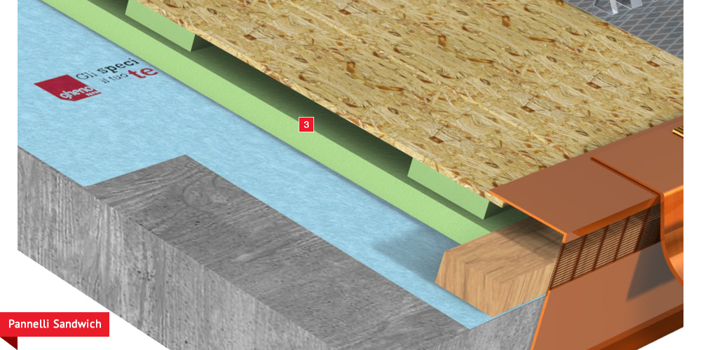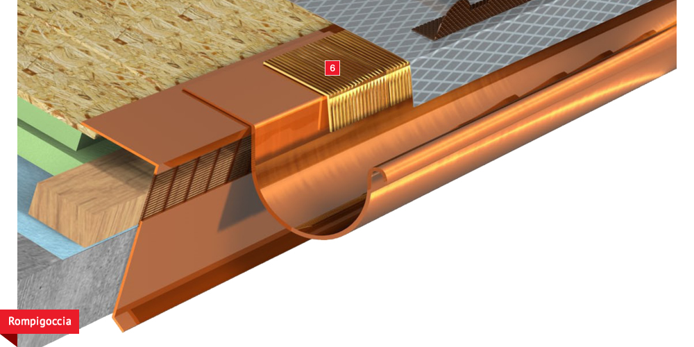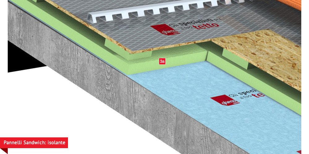 Pacchetto di copertura composto da un freno vapore impermeabilizzante ed altamente traspirante  , con tessuto non tessuto nella parte sottostante per il recupero ed il trasferimento in grondaia di eventuali condense in arrivo dagli ambienti sottostanti. Pannelli Sandwich  formati da un isolante termico ad alta densità e traspirabilità, da una camera d’aria  per la ventilazione che consente lo smaltimento del calore della copertura e da un piano di posa in lastra di legno fenolico OSB  per la posa delle tegole o dei coppi migliorando ulteriormente il confort abitativo sia d’estate che d’inverno; permette agli ambienti sottostanti di abbassare maggiormente la temperatura interna d’estate e di mantenere più a lungo il calore d’inverno. Impermeabilizzazione sottotegola o coppo con una seconda membrana impermeabilizzante altamente traspirante e riflettente  , sviluppata specificatamente per i tetti, dalle notevoli doti di resistenza meccanica, stabilizzata ai raggi UV, antiscivolo ed antiriflesso; la capacità di traspirazione consente al tetto di eliminare eventuali residui di umidità. Lo strato metallizzato riflettente respinge fino al 60% del calore emesso sottoforma di raggi infrarossi dalle tegole o dai dai coppi riscaldati dal sole e riduce del 20% il calore in arrivo dalla copertura ottenendo così un risparmio del 30% dell’energia annuale utilizzata in riscaldamento e/o condizionamento. Frontalino forato  sottogrondaia per il passaggio dell’aria all’interno della camera di ventilazione. Manto di copertura formato da tegole o coppi  , trattenuto da una rompitratta  in profili metallici, specifici per le grandi pendenze, microventilazione tramite griglie parapassero metalliche  sottocolmo ventilato .