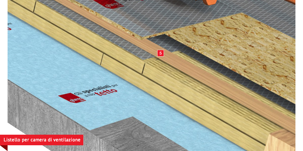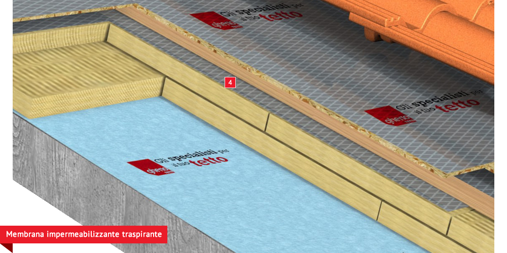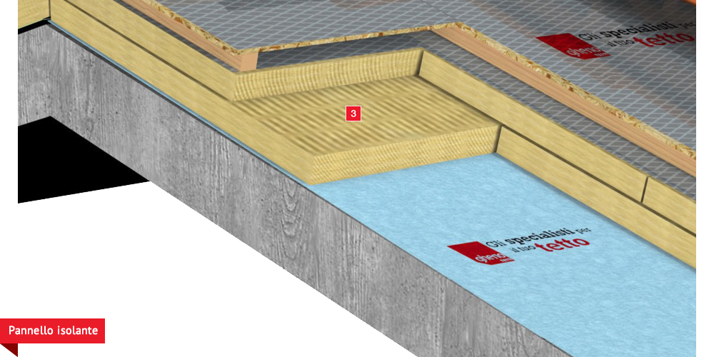 formato da pannelli ad alta densità e traspirabilità per migliorare ulteriormente il confort abitativo sia d’estate che d’inverno; permette agli ambienti sottostanti di abbassare maggiormente la temperatura interna d’estate e di mantenere più a lungo il calore d’inverno. Posa della seconda membrana impermabilizzante ed altamente traspirante