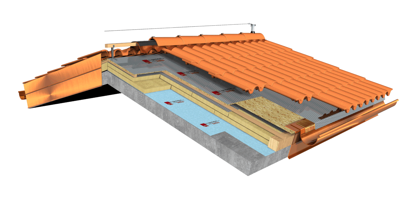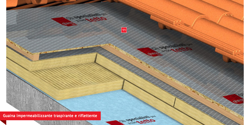 , sviluppata specificatamente per i tetti, dalle notevoli doti di resistenza meccanica, stabilizzata ai raggi UV, antiscivolo ed antiriflesso; la capacità di traspirazione consente al tetto di eliminare eventuali residui di umidità. Lo strato metallizzato riflettente respinge fino al 60% del calore emesso sottoforma di raggi infrarossi dalle tegole o dai dai coppi riscaldati dal sole e riduce del 20% il calore in arrivo dalla copertura ottenendo così un risparmio del 30% dell’energia annuale utilizzata in riscaldamento e/o condizionamento. Frontalino forato